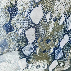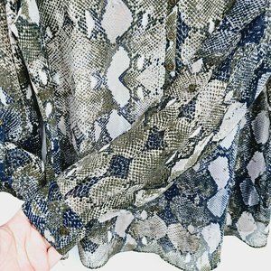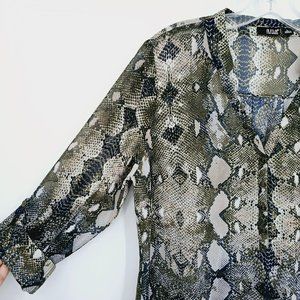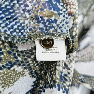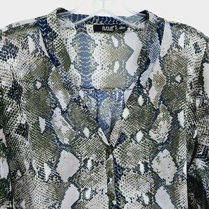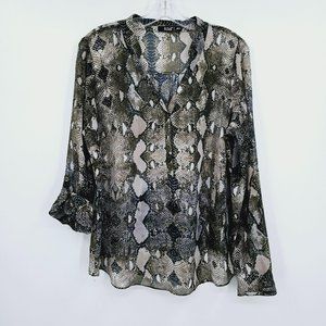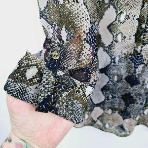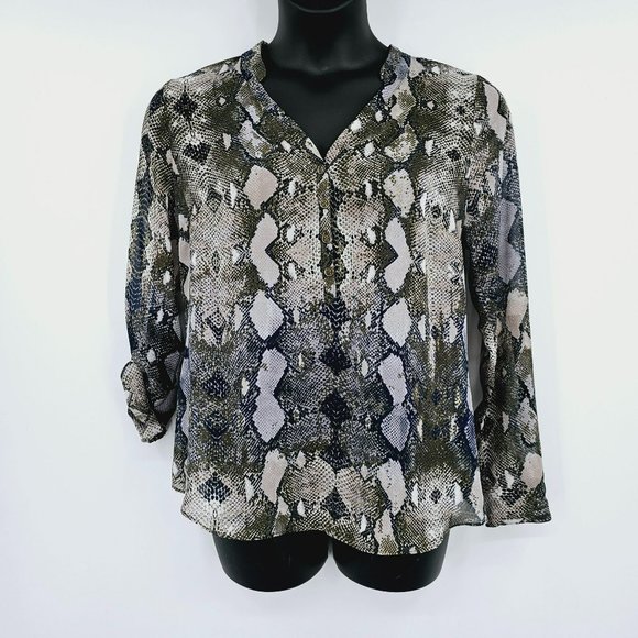 ANA A New Approach Popover Blouse L Blue Green Snake Print Semi Sheer Tab Sleeve