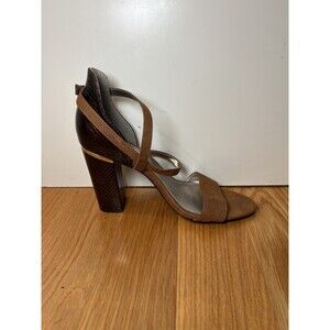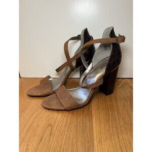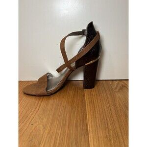 Color: Brown suede-style front, ankle and cross straps with dark brown faux snakeskin pattern block heels and back