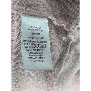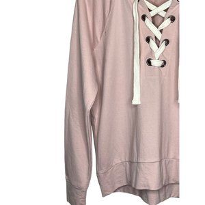 Pink sweatshirt with a V-neck, lace-up front, hi-lo hem, and long sleeves. Made of 60% cotton and 40% polyester. Machine washable and made in Vietnam.