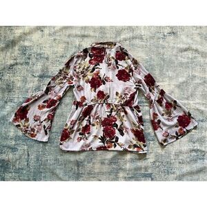 ANA Blue Red Floral Bell Sleeve Peasant Blouse w Choker V Neckline Medium
