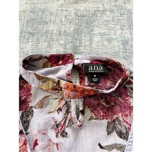 Blue peasant blouse with a red floral print from ANA A New Approach. Bell sleeves, collar neckline with a deep v front, and button at the back of the neck.