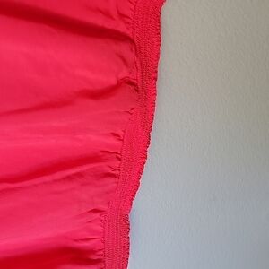 Really pretty coral -orange colored top. Cut out detail at the chest. Thin lightweight fabric. Elastic banded at the bottom. There is a hook eye closure in the back. Keyhole in the back. Fabric doesn't stretch. I would consider this minimally sheer. Summer, airy, breezy, casual, beachy, bold, vibrant, colorful, fun, cute, weekend, hang out, euro summer, tomato girl, curvy, plus