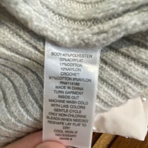 ANA A new approach brand sweater size 4x. This is such a cute sweater, very cottage core style. The sweater itself is a light gray color with a cream colored crochet collar. Ribbed at the bottom hem and wrists. The back has a keyhole with a button.