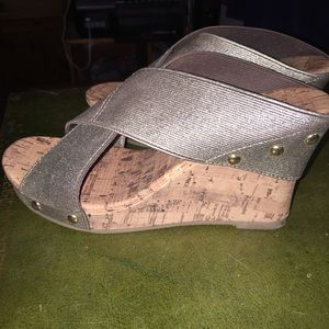 ANA Lexi style X-band wedge sandals with elastic X-band, accessorized with metallic studs and faux-cork platform heel. Bought a last year but never got used. I'm open to any offers! Thanks for looking!