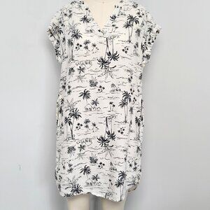 Excellent. New without tags. No visible flaws. Lightweight linen-blend tropical print T-shirt dress featuring short cuffed sleeves with rolled hem detail. Easy slip-on style with relaxed fit and side seam pockets. Versatile piece that can be worn as a beach cover-up, tunic top, or casual summer dress.