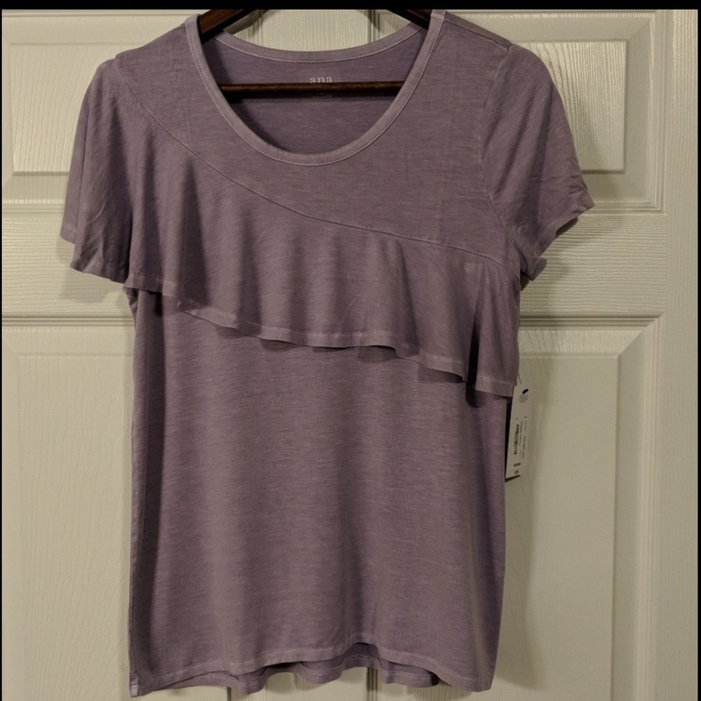 a.n.a NWT lavender ruffel tee size medium. Across chest laying flat measures 18 inches. Shoulder to hem measures 24 inches. (N)