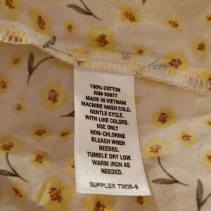 ~ Description: Yellow and green floral top, non-stretch semi-sheer material, ruffle trim collar, short sleeves, button front