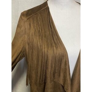 A.N.A. Western Faux Suede Fringe Drape Front Jacket Blazer in Brown Size medium. This is a very thin polyester faux suede drape front cardigan style or blazer style jacket. Great to layer with a western flair. Machine washable.