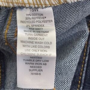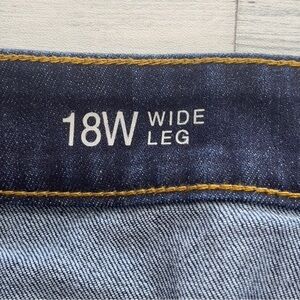 Dark wash denim, 5 pockets, zipper and button closure, stretch, wide leg, belt loopss, colors may vary due lighting, excell condition, 18W