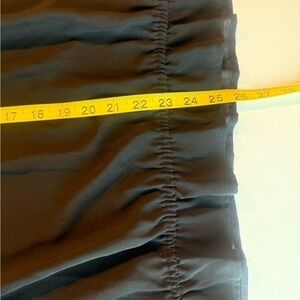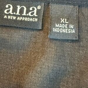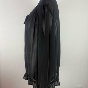 Lightweight black sheer blouse by A.N.A (A New Approach), size XL. Features a tie neck detail, long sleeves with elastic cuffs, and ruffle hem. Perfect for casual, office, or evening wear. In excellent pre-owned condition.