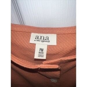 Add a pop of color to your wardrobe with this stylish A.N.A. tank top blouse. The top features a button front and wide ruffle straps for a trendy and feminine look. The sleeveless design and comfortable PM size make it a perfect fit for any occasion. The solid pattern and orange color add vibrancy to your outfit, while the accents of ruffle make it more fashionable. The closure is buttoned, with no straps to worry about, and the blouse is in perfect condition. Get ready to be noticed and feel confident in this beautiful blouse!