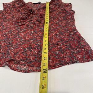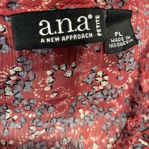 This is an a.n.a blouse for women in Petite Large size. It is a sleeveless tank top with a V-neckline and button closure. The blouse features a floral pattern on a multi-color chiffon fabric with pleated ruffle accents. It is made of 100% polyester and is recommended to be hand washed. This semi-sheer top is suitable for casual occasions in the summer and spring seasons.