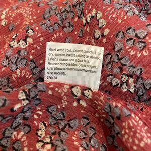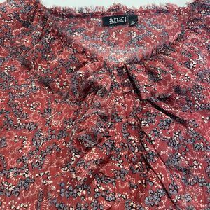 This is an a.n.a blouse for women in Petite Large size. It is a sleeveless tank top with a V-neckline and button closure. The blouse features a floral pattern on a multi-color chiffon fabric with pleated ruffle accents. It is made of 100% polyester and is recommended to be hand washed. This semi-sheer top is suitable for casual occasions in the summer and spring seasons.
