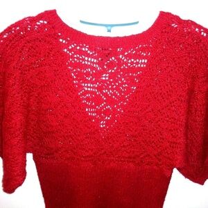ANA /a.n.a Red knit top/ Sweater Sz Medium, short sleeves. Deep V Neck. Crocheted yarn,