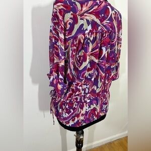 EUC top. It is sheer with lining. About a tunic style. Works well as a coverup easy on and off. There are drawstring on the sides to adjust if desired. The sleeves are about a3/4” with a stitched down cuff. They bell out slightly Great top to take you from the beach, lunch and shopping. No visible flaws. The length is about 28”. Pit to pit it measures about 20” because of the fullness. Questions please ask