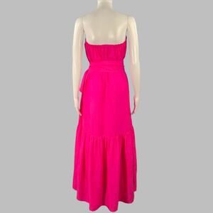 ANAAK "Sakura" dress in a pink silk featuring a strapless style, ruffled midi skirt, and self-tie sash which could be styled around the waist or neck.
