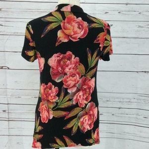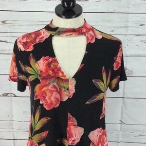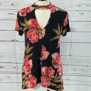 ANA Black Floral chocker Shirt with open hole on front of shirt. 96% rayon 5% spandex
