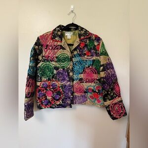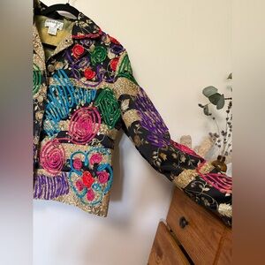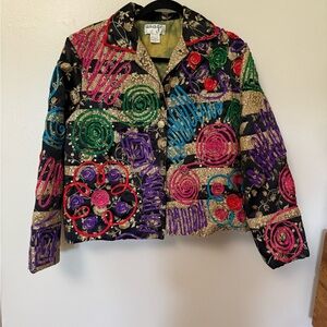 Vibrant blazer with intricate embroidery and gold buttons. Features bold multicolor patterns. Ideal for a statement look.