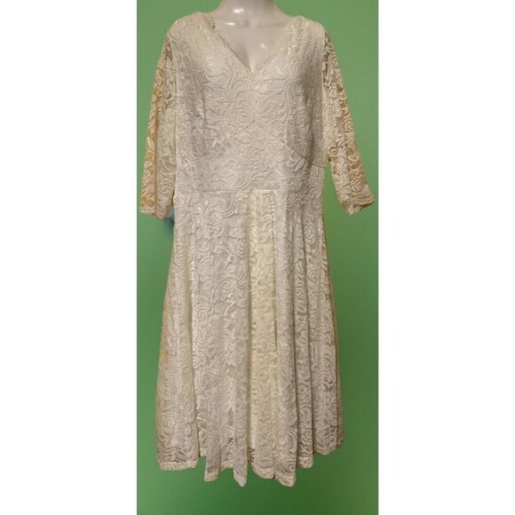 ANAOUR White Lace 3/4 Sleeved Knee-Length Dress SiZ 3XL Feminine Stretchy Luxury