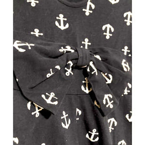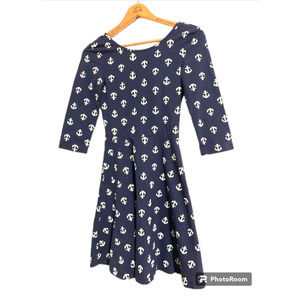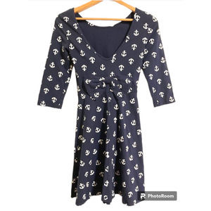 # blue pattern dress, dark blue, navy, anchor pattern, anchor print, nautical, boat dress, sailor dress, women's small, a line bottom, stretchy, bow dress
