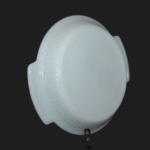 Vintage Anchor Hocking Fire-King 9" Pie Plate Milk Glass with ribbed side and handles. The bottom is marked "1460 Anchor Hocking Fire-King Oven-proof Made in the USA 9 IN. USA"