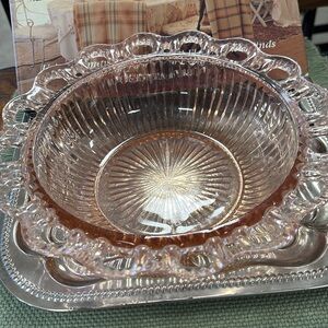 ANCHOR HOCKING GLASS - LACE EDGE PINK PATTERN - RIBBED ROUND BOWL