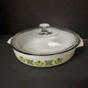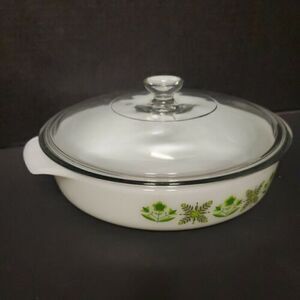 ANCHOR HOCKING MILK WHITE GLASS 1.5 QT Green Floral Pattern CASSEROLE DI…