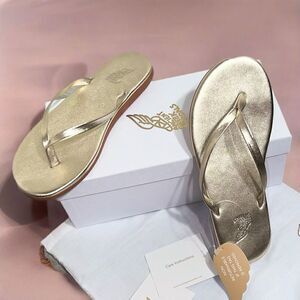 New in box and comes with original dust bag, perfect new condition! Low-key yet elegant; these sandals are a gorgeous platinum gold. These are my absolute favorite sandals and are a summer staple for me, selling because I wanted more colors but I accidentally purchased these in a size too small.