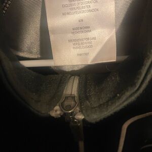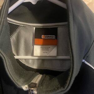 Sporty zip-up jacket by And1. Black body with dark gray raglan sleeves. Contrast white piping and embroidered logo on chest. Full zip front and stand collar. Clean athletic styling for casual wear.