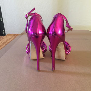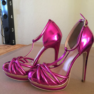 Nice Good Condition Bright Purple with Gold trim Size 8 ANDERA High Heels, has a few very small scuffs on Heels see picture #6.