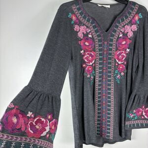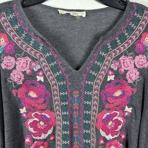 ANDRE By Unit Floral Embroidery Gray Small Top Colorful Boho Hippie Artsy