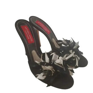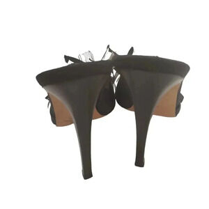 The black leather sandals feature a slim heel and boasts a unique ribbon upper. The open-toe design is adorned with beautiful rhinestone accents, adding a touch of glamour.