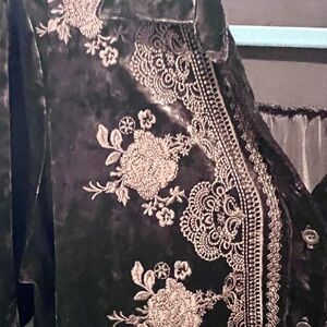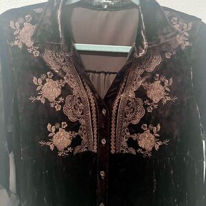 PREOWNED exquisite blouse from ANDREE BY UNIT features a luxurious velvet fabric adorned with intricate embroidery, offering a touch of sophistication to any ensemble. Its elegant design makes it perfect for special occasions or a refined evening out. This blouse looks like Johnny Was designed.
