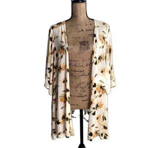 Elegant floral kimono jacket. Features cream base with yellow and black floral patterns. Lightweight and stylish.