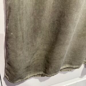 Stylish olive tunic with intricate embroidery. Perfect for casual outings. Slits on sleeves. Acid wash fabric has natural intentional variations of darker and lighter color throughout top.