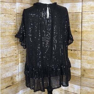 This blouse has a glamorous and festive style, perfect for a party or special occasion. The combination of sequins and ruffles gives it a fun and feminine flair. The blouse is a solid black color and is entirely covered in shimmering sequins, providing a glittering effect. Blouse is layered. No flaws. In like new condition. Offers welcome.