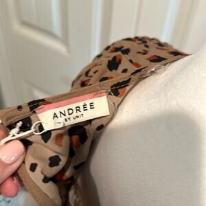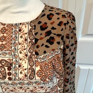 New with tags (NWT) ANDREE BY UNIT size small mixed print long sleeve blouse in neutral earth tones: rust, tan, black and ivory. Blouse is lightweight and mixed patterns are boho vibes with the paisley and animal print. Babydoll silhouette with the mixed prints that resemble patchwork but have definition at the chest. Keyhole detail in back and ruffle on sleeves at wrist with elastic banding. Top is lightweight and suitable for all seasons either on its own with slacks or layered under a jacket or blazer in fall or winter. Could be worn to the office or would make a fun festival or look especially heading into fall. Lots of way to style.