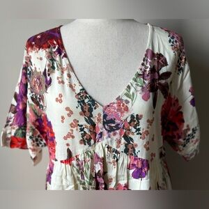 Pre-owned in like-new condition. Gorgeous floral print on a flattering v-neck, babydoll silhouette.