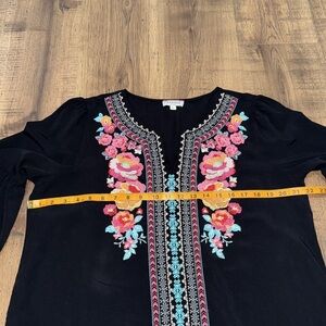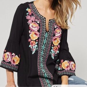 This stylish black Blouse from ELF features vibrant pink floral embellishments and a V-neckline, perfect for a chic bohemian look. The 3/4 length sleeves are adorned with matching embroidery, adding a touch of elegance to its flowing silhouette. Ideal for casual outings, this top combines traditional craftsmanship with modern flair.