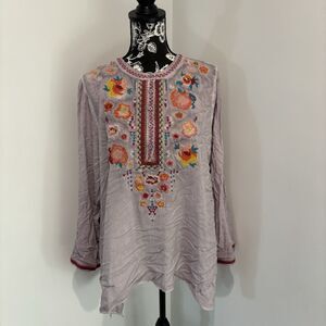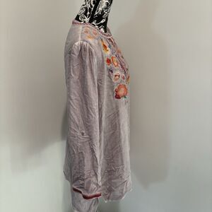ANDREE by Unit Purple Rayon Roll Tab Sleeve Embroidered Top TunicJohnny Was M