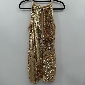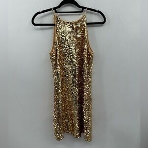 ANDREW CHARLES gold sequined tie neck midi womans evening sparkle dress XS