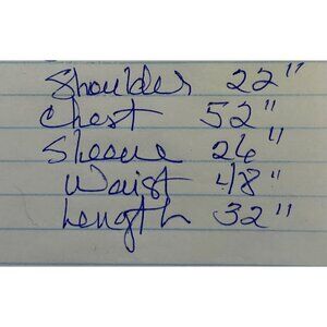 Size: XL Measurements: Shoulder 22", Chest 52", Sleeve 26", Waist 24" (48" doubled), Length 32"