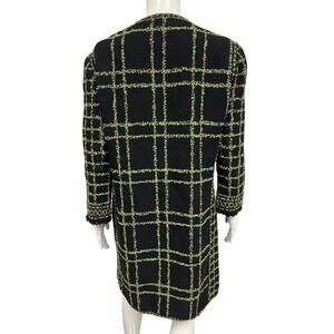 This ANDREW GN Black Knit Cotton Floral Tweed Embroidered Mid-Length Jacket Coat in EU 46 offers a sophisticated take on contemporary outerwear. Featuring a striking plaid pattern accented with detailed floral embroidery, it boasts a polished collarless design, a practical zip closure, and handy slit pockets. This knee-length coat effortlessly blends elegance with everyday functionality, making it a standout addition to any wardrobe.