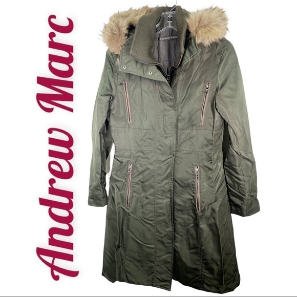ANDREW MARC Olive Army Green Long Down Coat With Racoon Fur Trimmed Hood, Size Small.