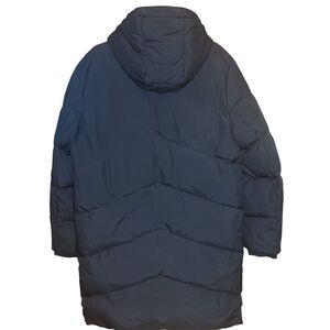 This longline puffer jacket is insulated down and feather and has an attached drawstring hood.