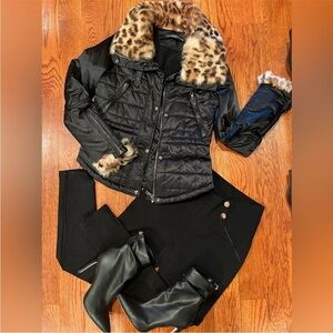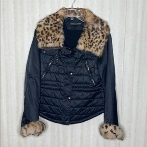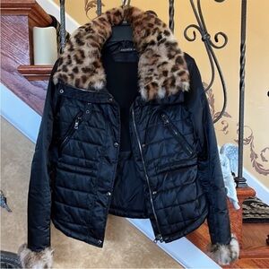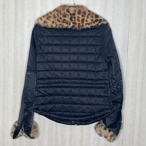 🦋ANDREW MARC Thermore Black Puffer Jacket W/Faux Leopard Fur at Collar and Cuffs