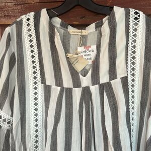 ANDTHEWHY heather black/white stripe open lace accent bishop sleeve flowy boho top. Elastic cuff. V neck. Back yoke with center pleat. Sharkbite hem. New, with tag. Small -slightly oversized - armpit to armpit approximately 21 inches. Shoulder to hem approximately 26 1/4 at shortest length. Cotyon/spandex blend. Nonsmoking home.