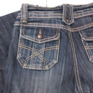 Gently used 4-pocket dark blue stretchy denim jeans,
