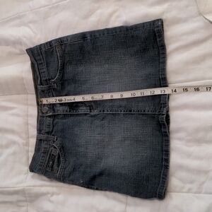 Angel jeans denim skirt size girls 5. In great condition with 2 front pockets and 2 back pockets and a front coin pocket. Button and zip fly. There is a small white spot about hip high on the left side but it may come out with laundering.