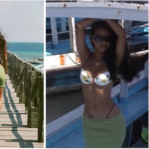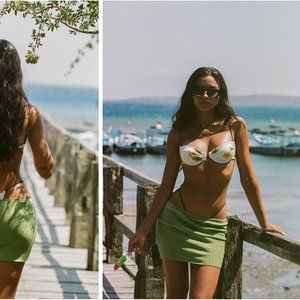 Angela solid basic mini skirt in Leaf. An itty bitty knit mini we throw on over swimwear or pair with our fave Brittany halter top. A micro mini to create a sexy look without squeezing - this mini fits everyone. Created with our comfy tissue rib spandex handknit. Runs true to size. Lifestyle model Sabi wears size S. First studio model Noemie wears size S. Second studio model Lente wears size XS.